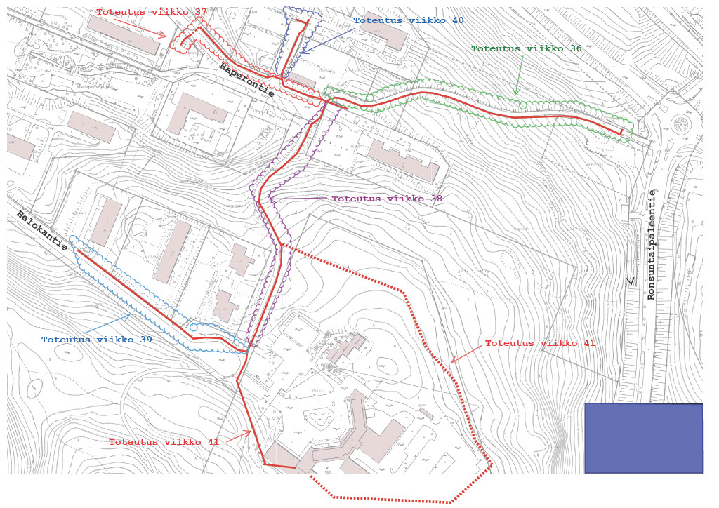 Työt on käynnistetty kuluvalla viikolla Haperontien suunnasta kevyen liikenteen väylää pitkin kohti Ronsuntaipaleentietä. Kevyen liikenteen väylällä säilyy kulku, mutta työalueella liikkuvia henkilöitä pyydetään noudattamaan erityistä varovaisuutta mäkisellä osuudella. Kaivutyöt etenevät liitteenä olevan kartan mukaisesti, linkki karttaan.
